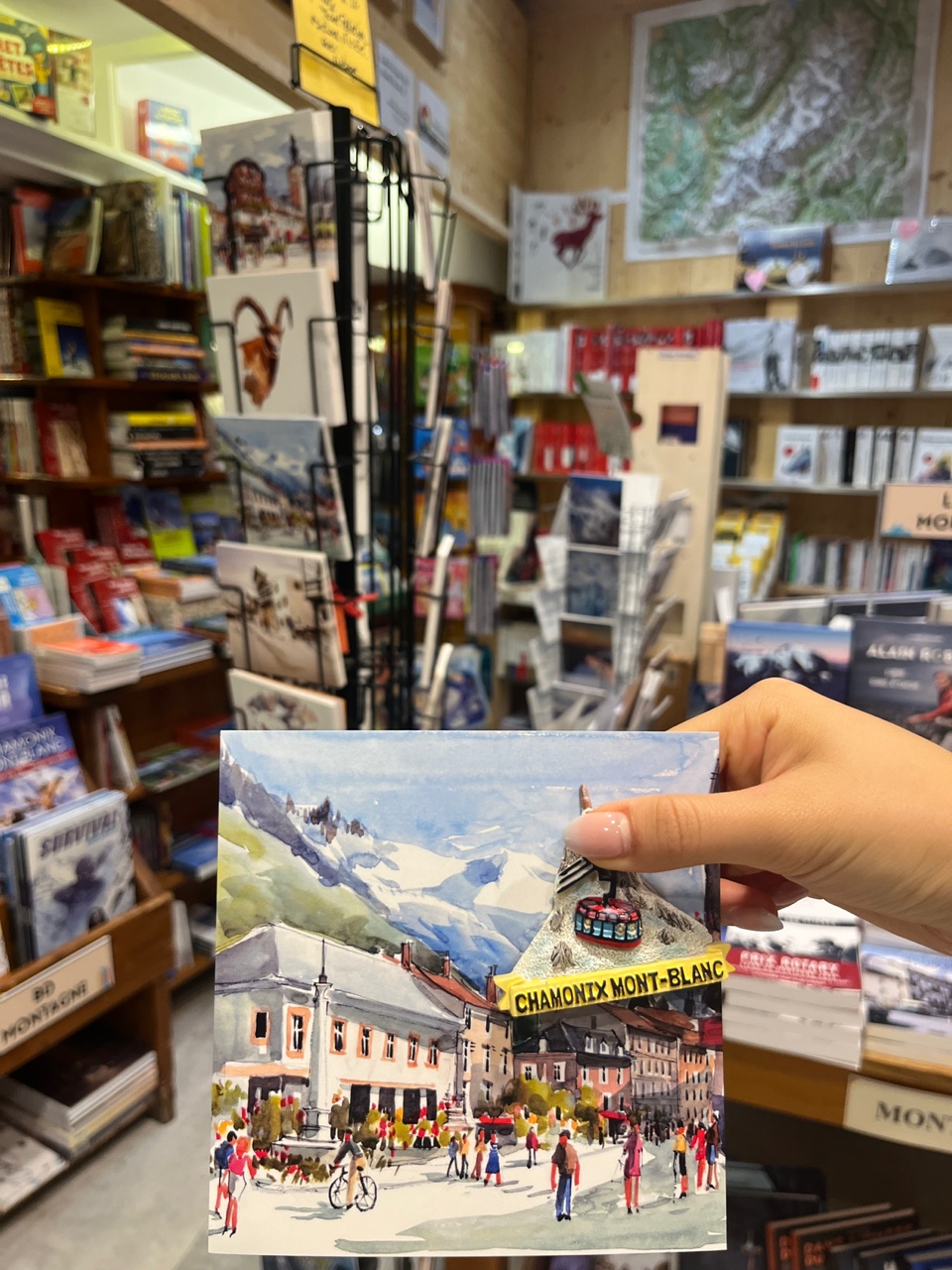 이 기념품 숍은 Place Balmat 광장 근처에 있는 오래된 서점인데, 샤모니의 산과 마을이 섬세하게 표현된 수채화 엽서, 자석, 지도가 다양하게 진열되어 있어요.